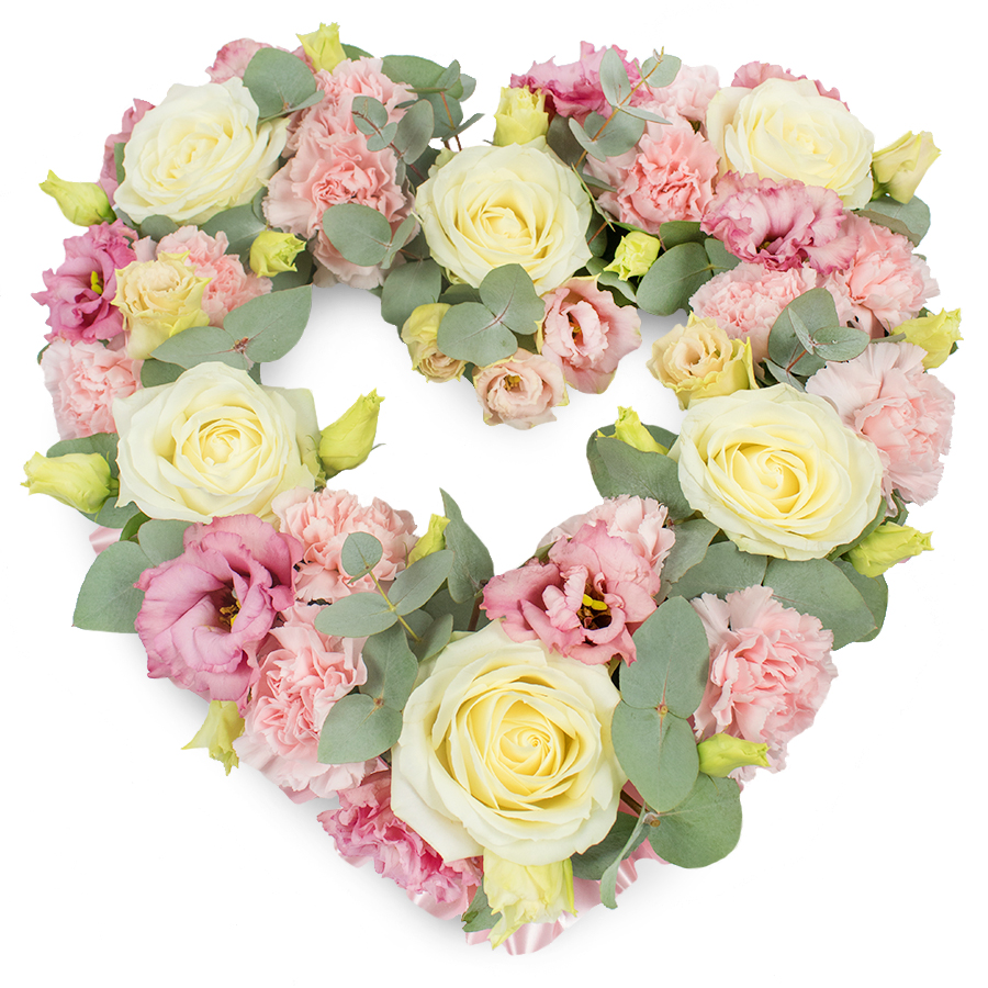 Pay your respects with our Elegant Memorial Bouquet. This beautiful arrangement features a graceful blend of white roses, pink carnations, pink lisianthus, and eucalyptus leaves, thoughtfully designed to honor and remember your loved one.
